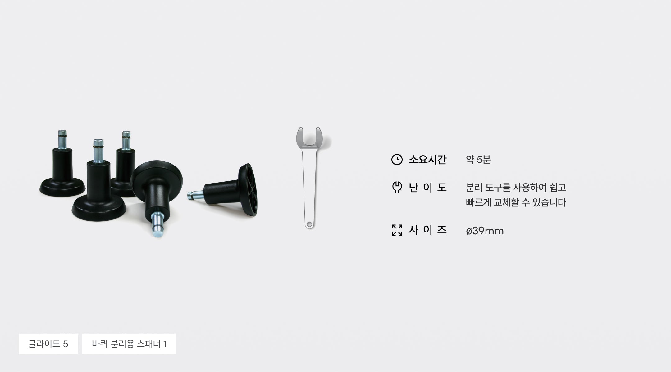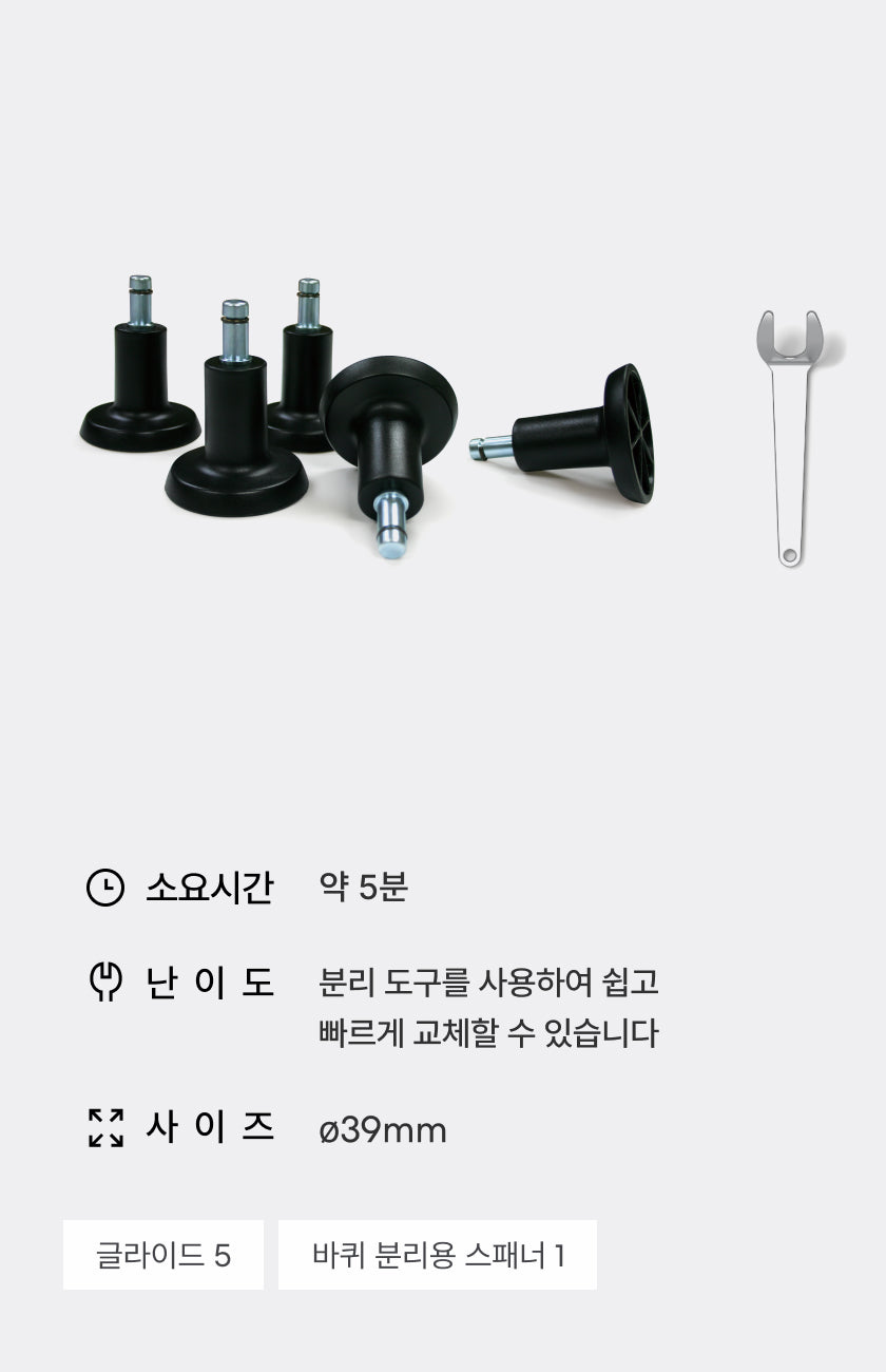 기존 바퀴와 섞어서 사용하면 높이가 맞지 않아 의자가 전도될 위험이 있습니다.
