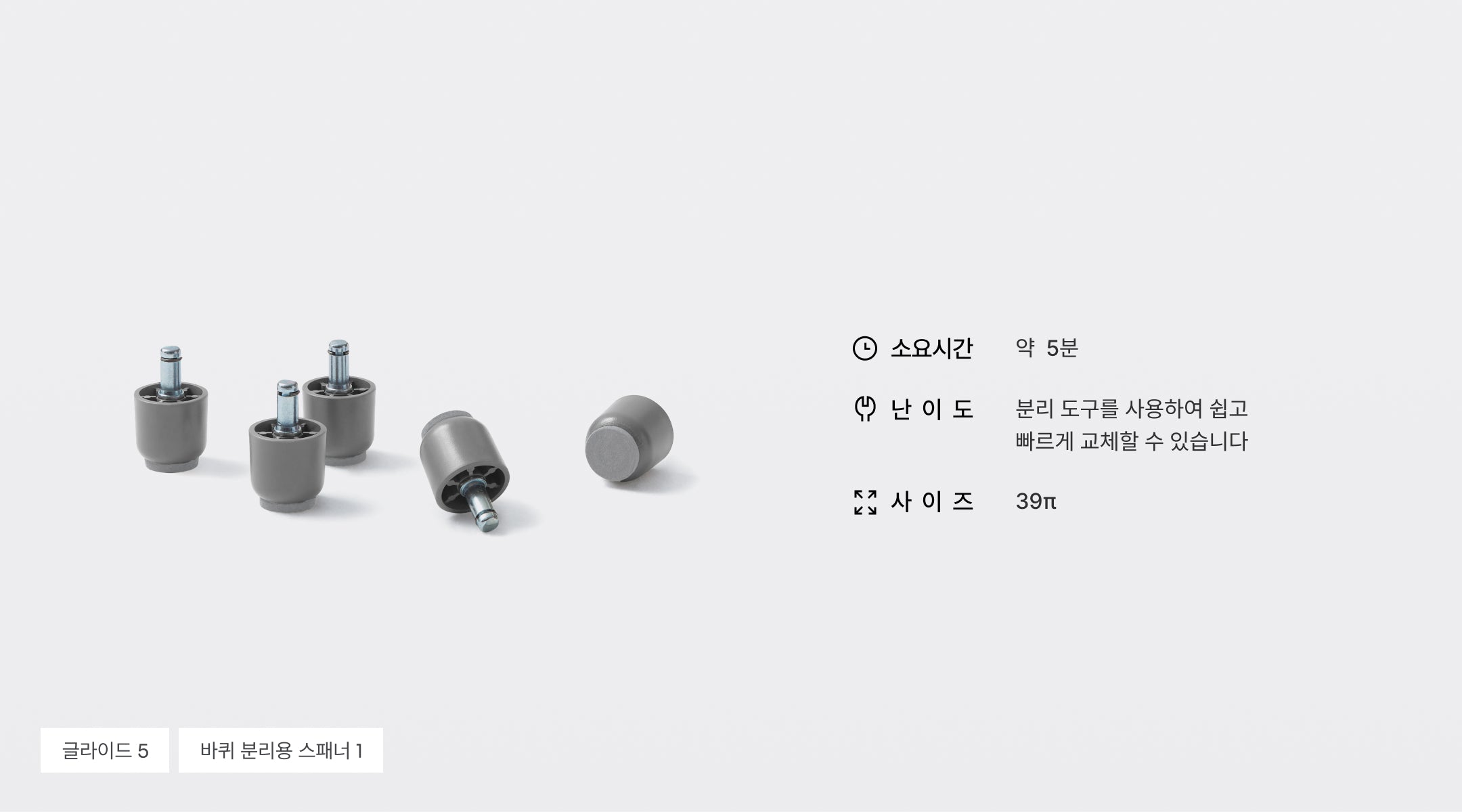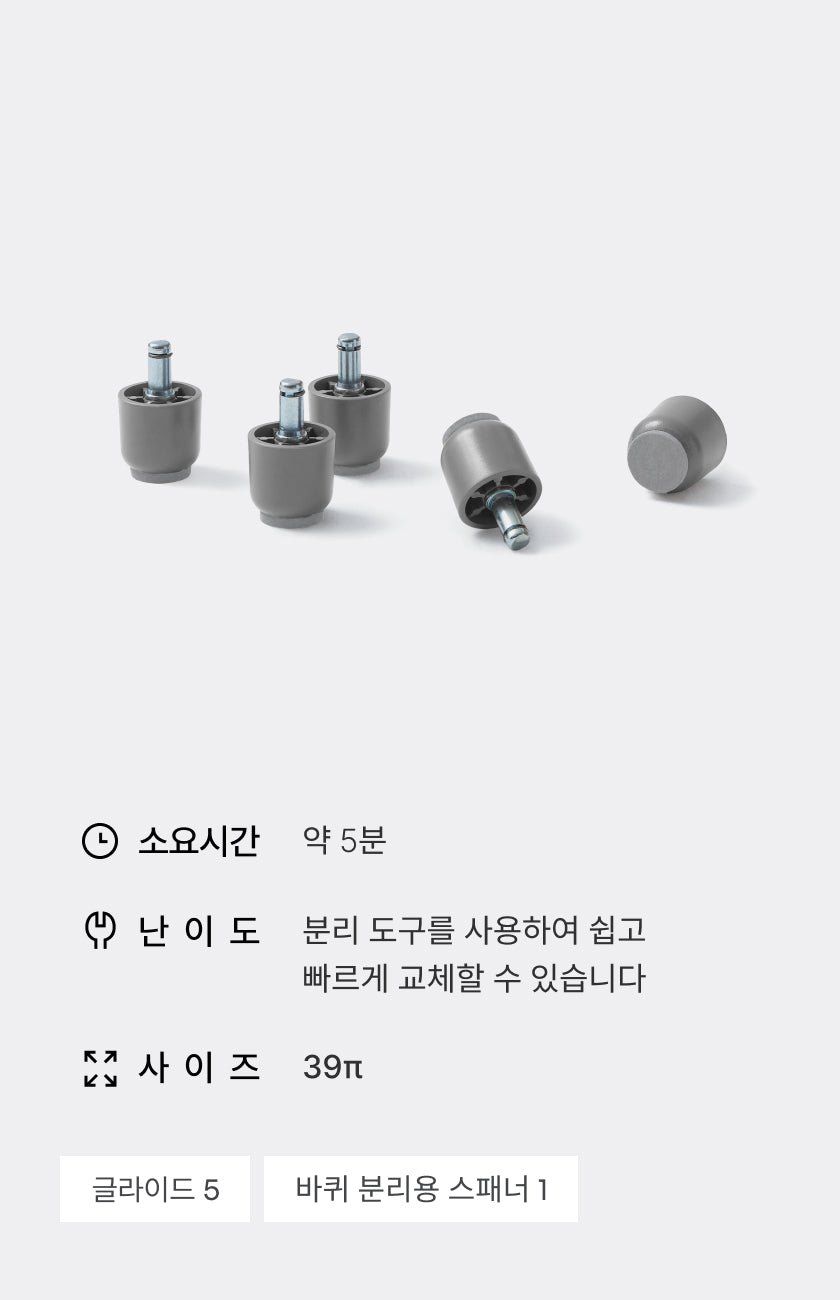 기존 바퀴와 섞어서 사용하면 높이가 맞지 않아 의자가 전도될 위험이 있습니다.